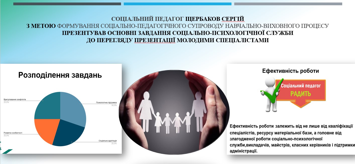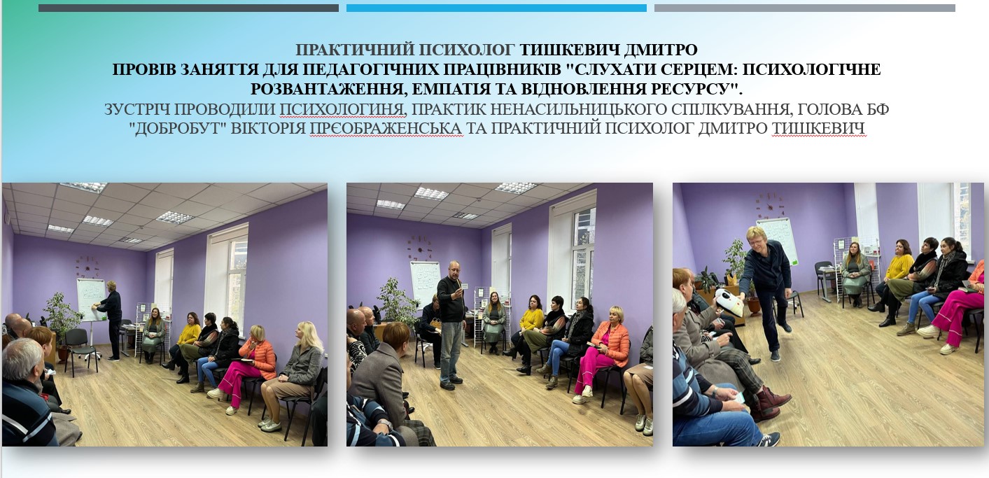 Важливим напрямом сьогодення є і соціально-психологічний супровід педагогічних працівників соціальним педагогом Щербаковим С.Д. та практичним психологом Тишкевичем Д.С. відповідно до плану-заходів “Слухати серцем: психологічне розвантаження, емпатія та відновлення ресурсу”, з порадами ефективної та злагодженої роботи колективу.