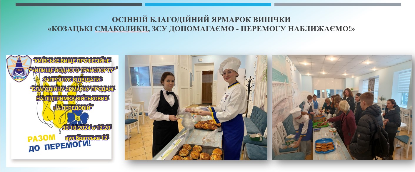 Осінній благодійний ярмарок випічки «Козацькі смаколики, ЗСУ допомагаємо – перемогу наближаємо!». Спільно здобувачі освіти під професійним керівництвом майстрів виробничого навчання ДПТНЗ Київське вище професійне училище водного транспорту, продовжують свою місію організовувати благодійні ярмарки на підтримку ЗСУ, організовані посилки зі смаколиками нашим захисникам та допомога у придбанні допоміжного обладнання.