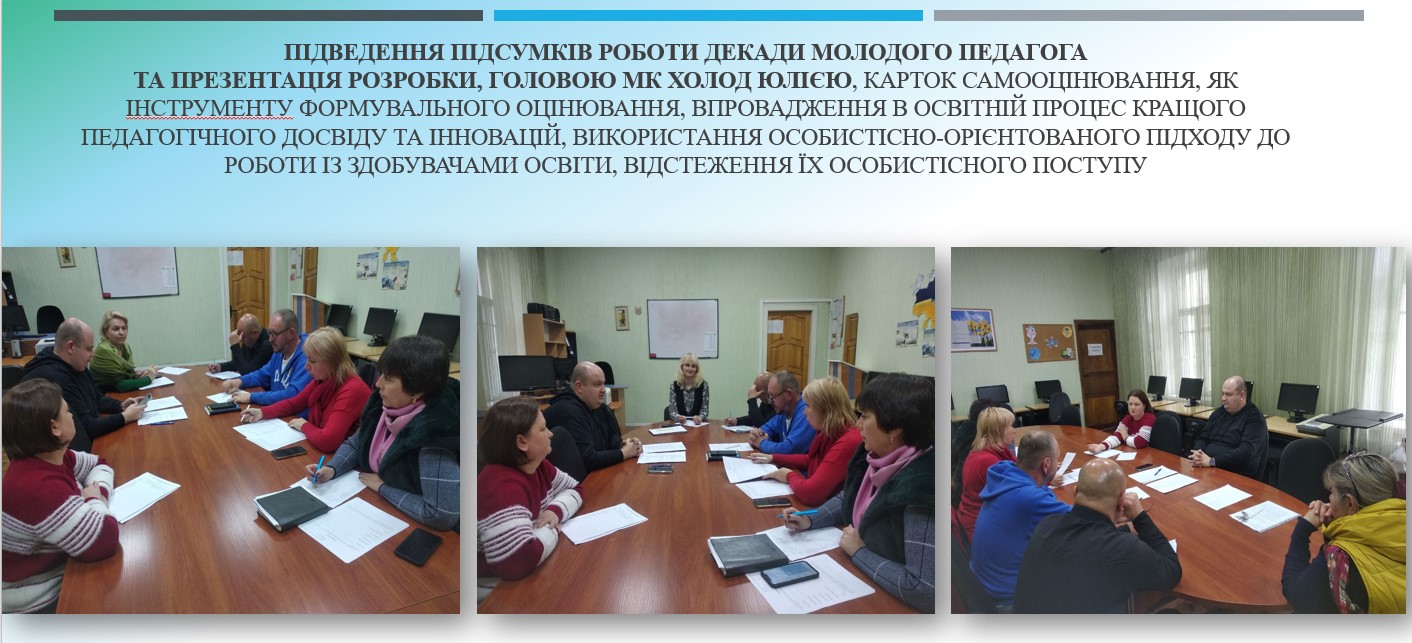 Головою Методичної комісії, майстром виробничого навчання Холод Ю.Ю. презентовано розробку карток самооцінювання, як інструмент формувального оцінювання, впровадження в освітній процес кращого педагогічного досвіду та інновацій, використання особистісно-орієнтованого підходу до роботи із здобувачами освіти, відстеження їх особистісного поступу.