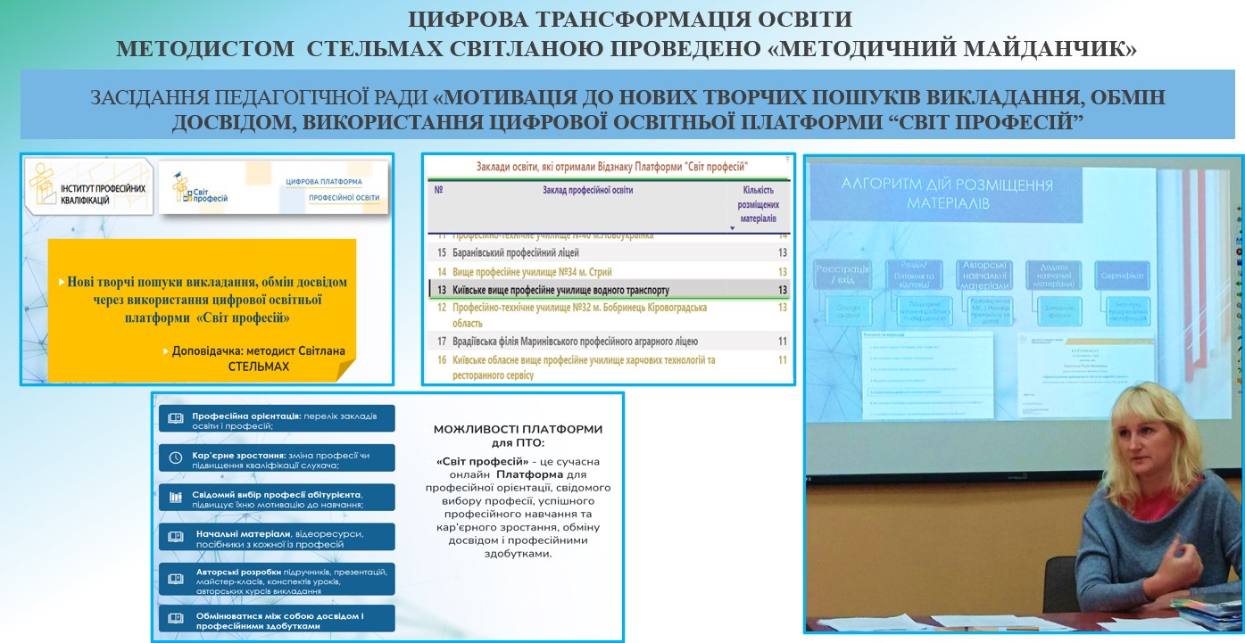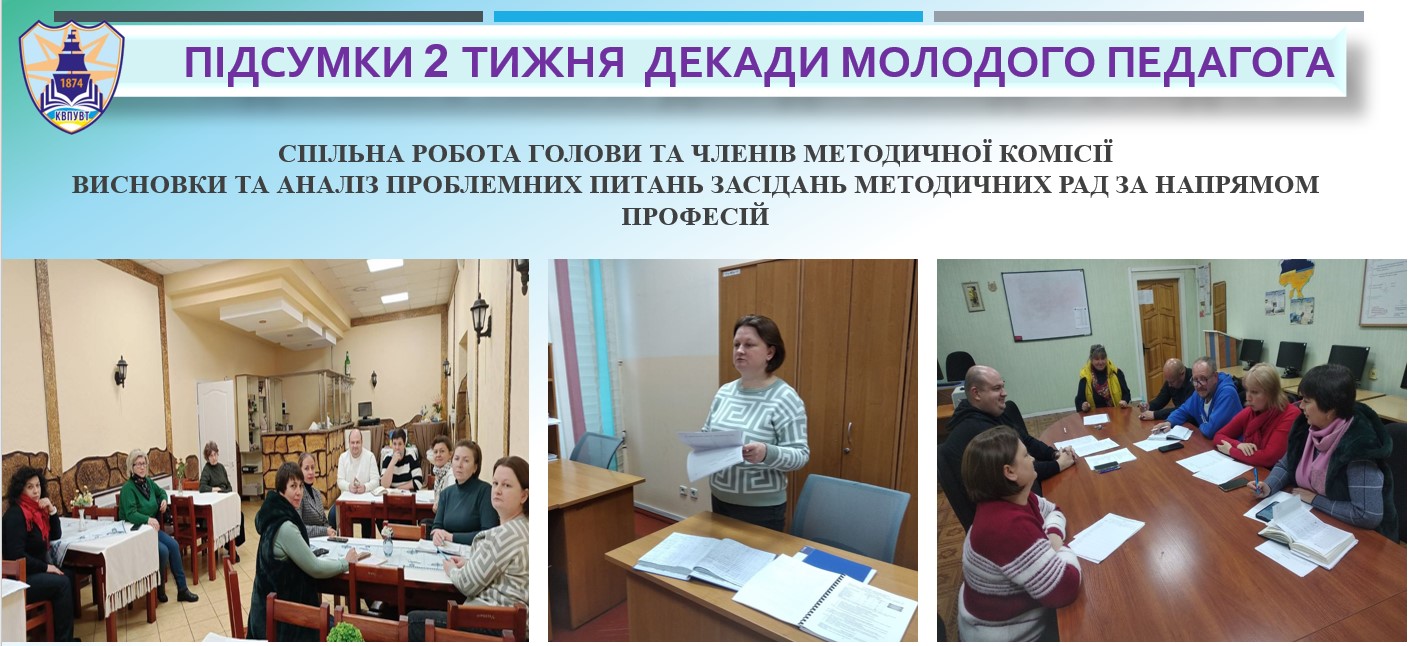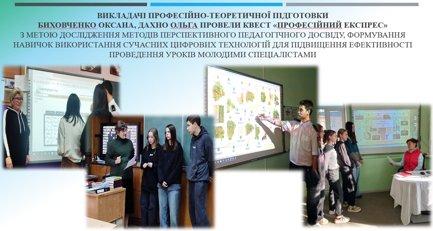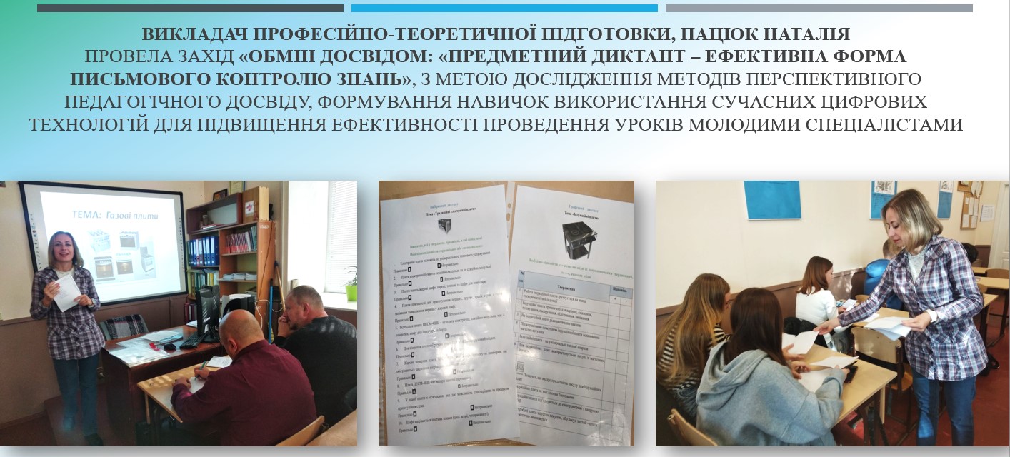 У другий тиждень відповідно планування Декади молодого педагога, проведено заходи направлені на розвиток професійних умінь молодих спеціалістів, дослідження методів перспективного педагогічного досвіду через проведені викладачами професійно-теоретичної підготовки Биховченко О.В., Дахно О.М., Пацюк Н.О., Янковською О.О. уроку-квесту для здобувачів освіти «Професійний експрес» та уроку з перевірки знань методом «Предметний диктант – ефективна форма письмового контролю знань».