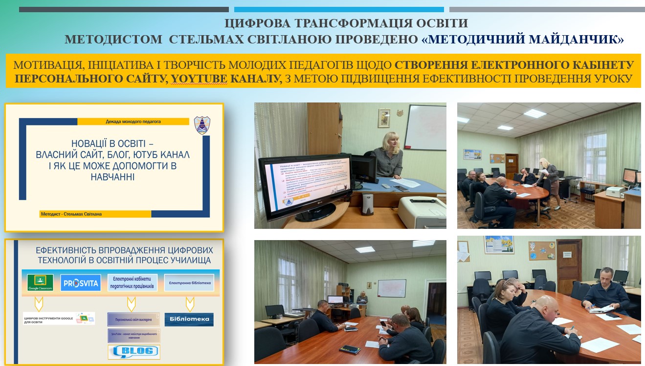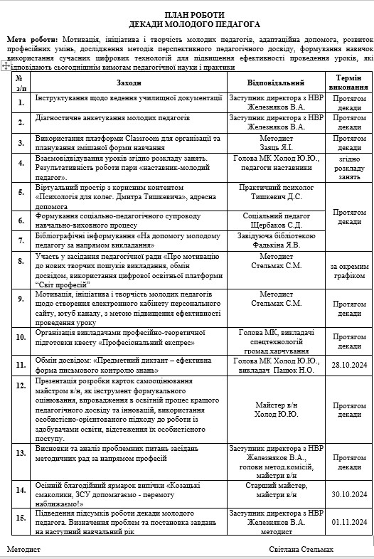 У жовтні 2024, продовжили діяльність «Школи молодого педагога» з метою чіткої організації на сучасному рівні роботи з молодими спеціалістами, спрямованої на підвищення рівня їхньої психолого-педагогічної, загальнокультурної, фахової й методичної підготовки.