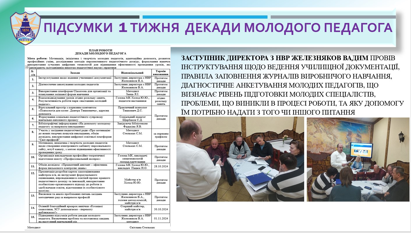 Железняков В.А. – заступник директора з навчально-виробничої роботи, методист Стельмах С.М., старший майстер Зінченко Н.В., наставники та молоді спеціалісти, майстри виробничого навчання, протягом першого тижня Декади приймали участь у ряді заходів відповідно до Плану роботи. Проведено засідання “Методичний майданчик”, анкетування молодих педагогів для визначення, якої методичної допомоги найбільше потребує педагог, стану методичної підготовки молодого спеціаліста; для вивчення запитів, діагностування труднощів; діагностики рівня творчої педагогічної діяльності та професійної майстерності педагогів.