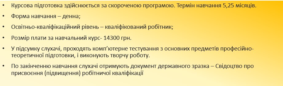 Якщо ви бажаєте змінити свою професію на більш затребувану на сучасному ринку праці, отримувати гідну заробітну платню! Наш заклад освіти чекає на тебе! Без вікових обмежень.
