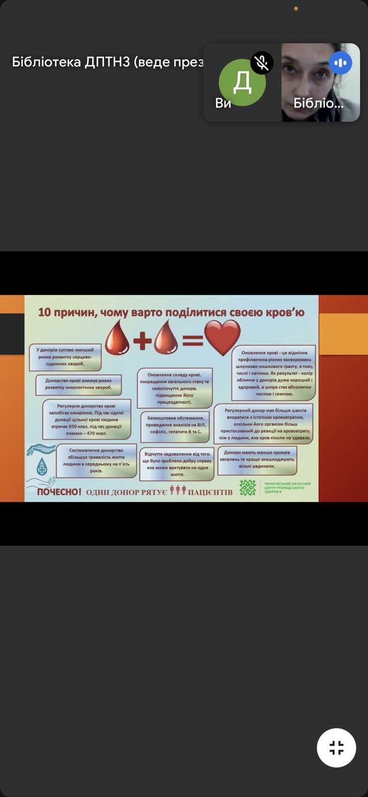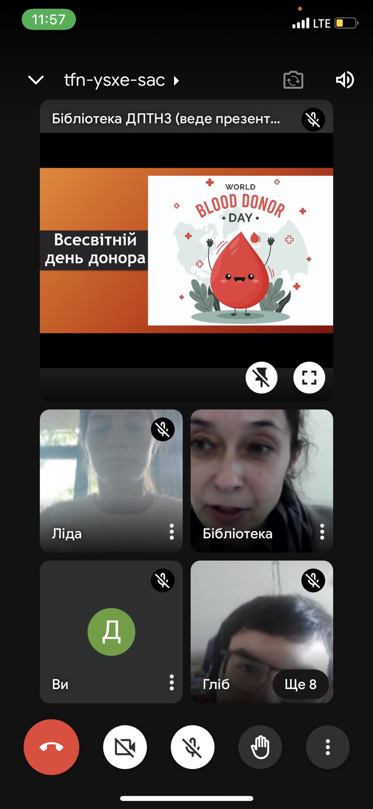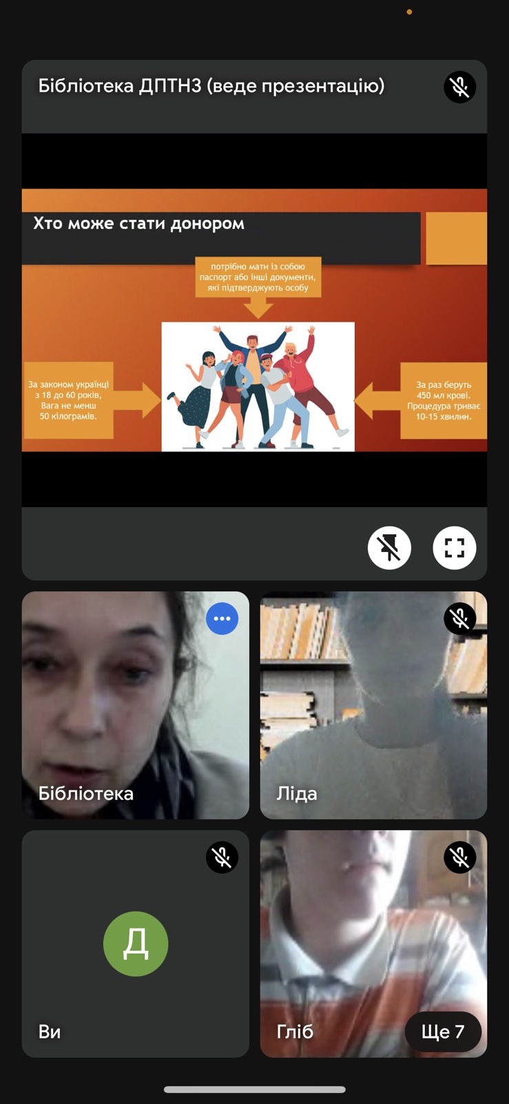 Напередодні цього дня, для здобувачів освіти груп П-22 і П-23 був проведений online-захід “Всесвітній день донора”, який провела завідувач бібліотеки Яна Фадькіна.