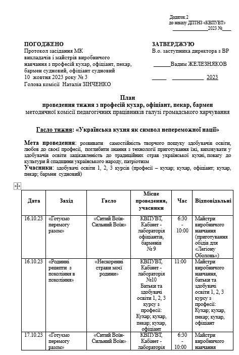 План проведення тижня з професій кухар, офіціант, пекар, бармен