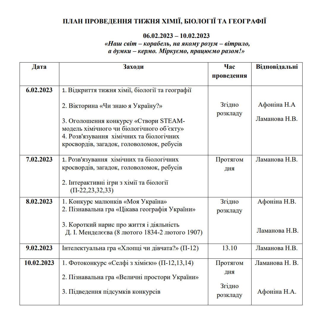 Відповідно до річного плану роботи методичної комісії з 06.02.23 по 10.02.23 в училищі проходить предметний тиждень хімії, біології та географії.