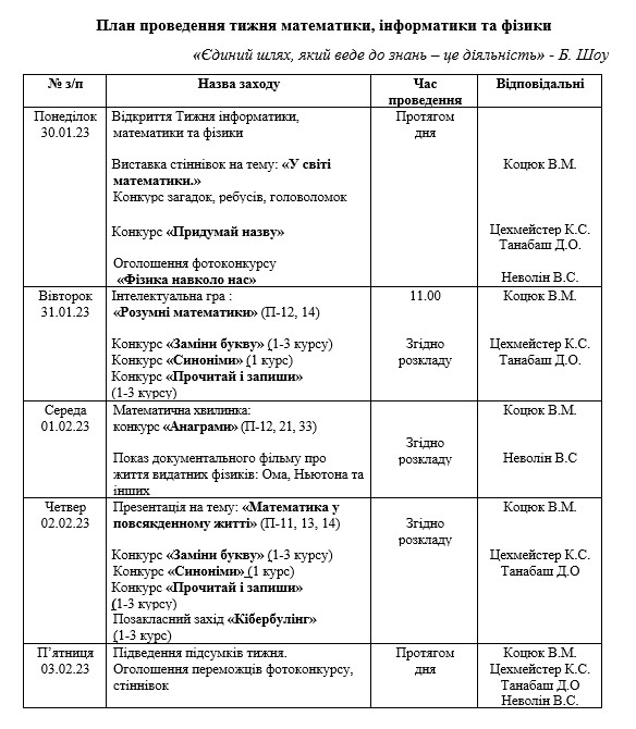 Відповідно до річного плану роботи методичної комісії викладачів природничо-математичної підготовки з 30.01.23 по 03.02.23 в училищі проходить предметний тиждень інформатики.
