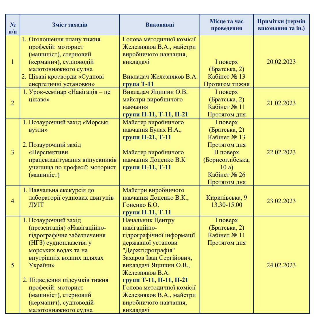 ПЛАН ЗАХОДІВ ДО ТИЖНЯ ПРОФЕСІЙ: МОТОРИСТ (МАШИНІСТ), СТЕРНОВИЙ (КЕРМАНИЧ), СУДНОВОДІЙ МАЛОТОННАЖНОГО СУДНА