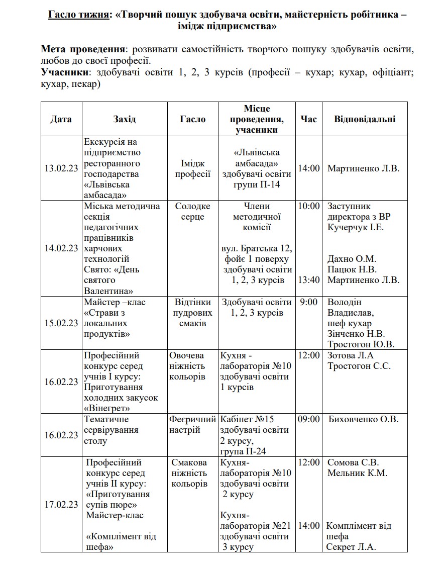 Методичної комісії викладачів і майстрів виробничого навчання з професій кухар, кухар судновий, офіціант, пекар, бармен судновий, офіціант судновий