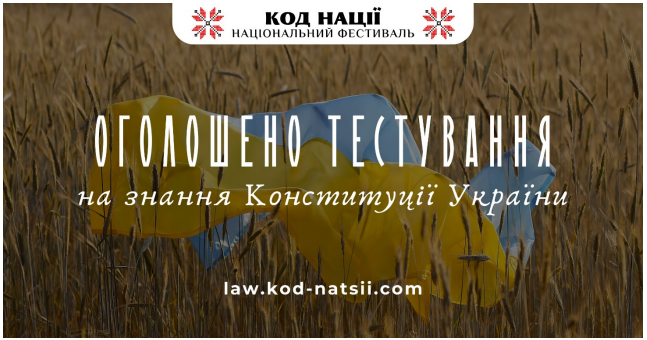 Освітньою платформою Національного Фестивалю “Код Нації” оголошується проведення Тестування на знання Конституції України, яке присвячене 28-й річниці прийняття Конституції нашої Держави.