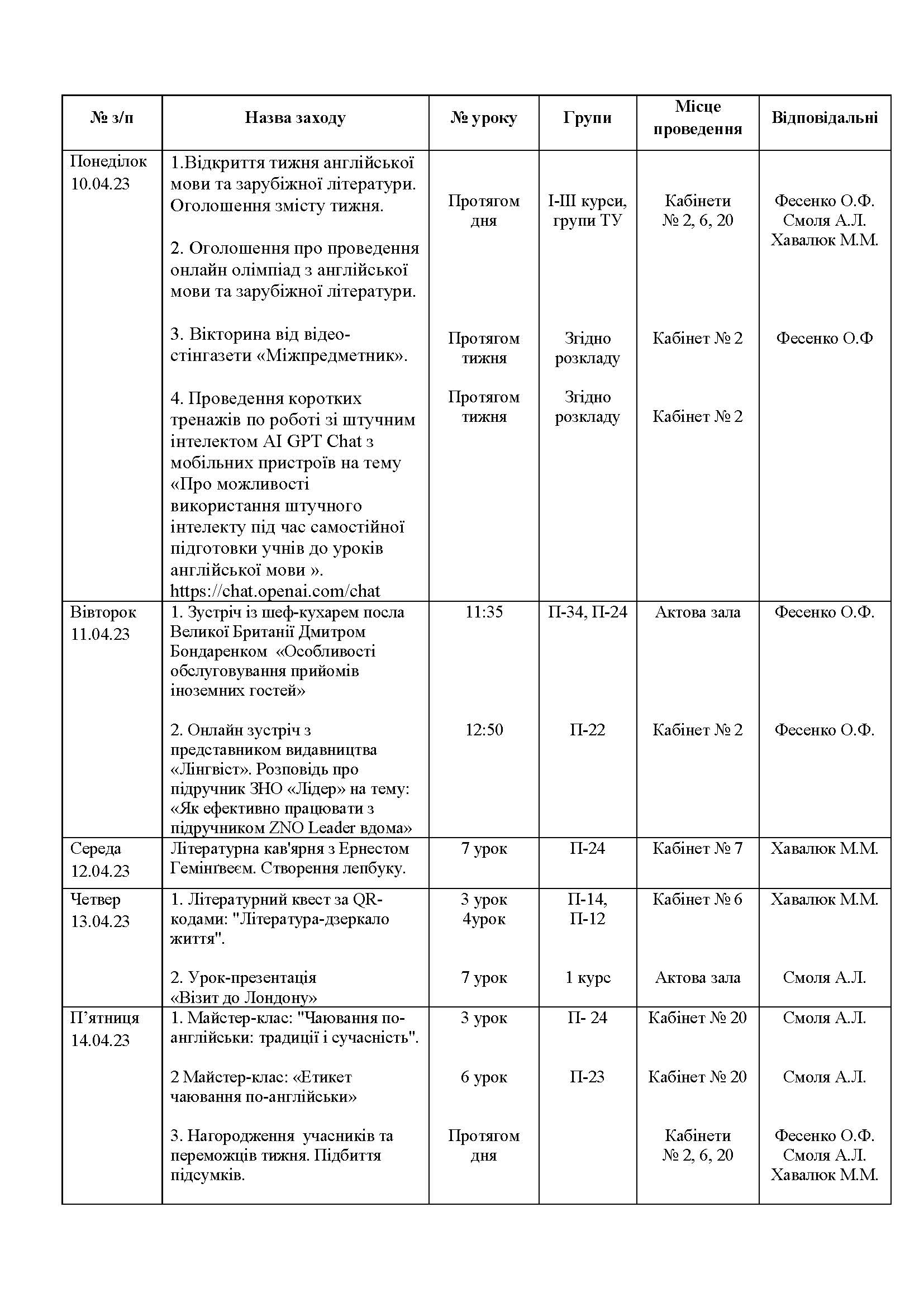 Саме із такою назвою 13 квітня 2023 року в межах тижня англійської мови та зарубіжної літератури відбувся квест за QR-кодами. Брала участь група П-14 під керівництвом викладача Хавалюк Мар’яни Михайлівни.