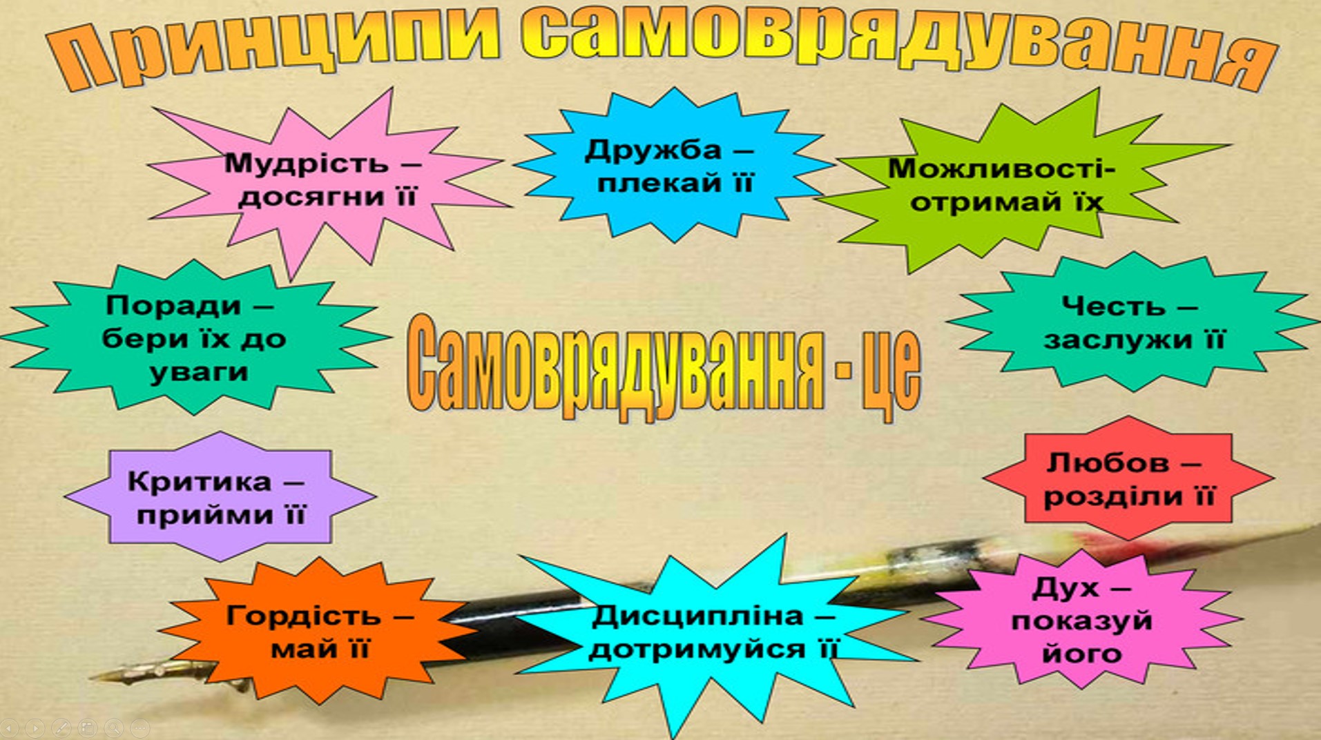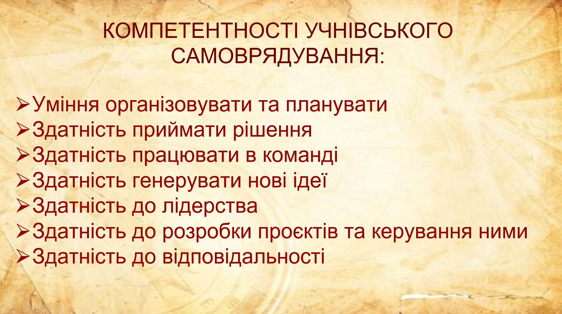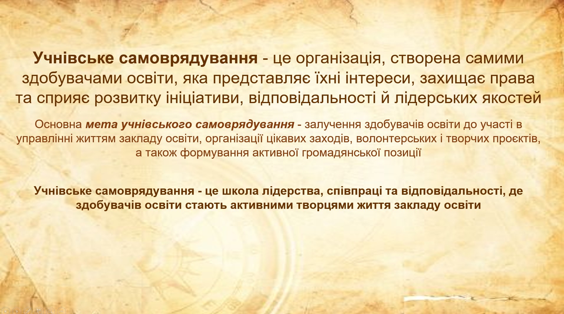 - Учнівське самоврядування пропагує відносини та співпрацює з різними громадськими об’єднаннями на принципах взаємодопомоги і незалежності; співпрацює з педагогами і батьками.