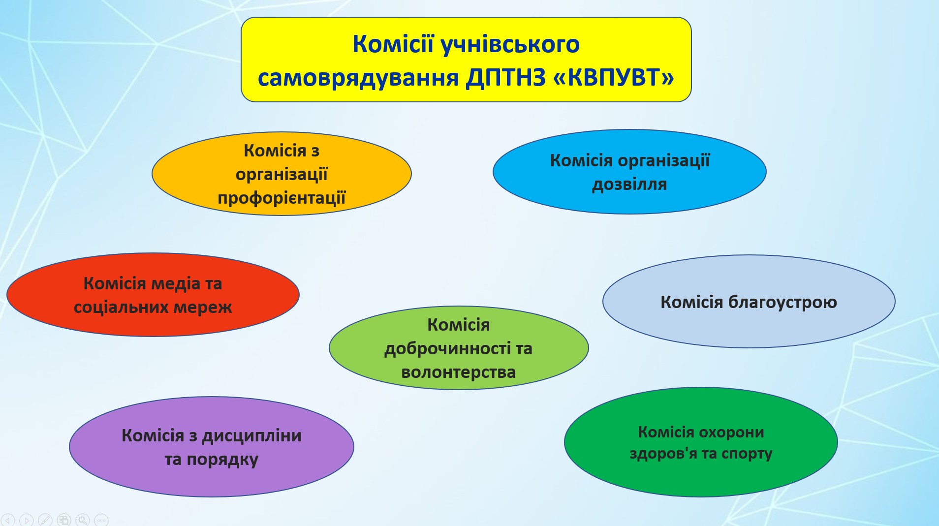 - Учнівське самоврядування ДПТНЗ “КВПУВТ” регламентує свою діяльність на підставі нормативно-правових актів Конституції України, Всесвітньої декларації про права дитини, Законів України «Про освіту», «Про громадські організації», Статуту навчального закладу.